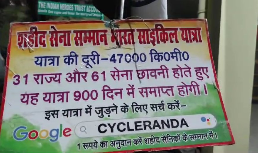 भारत का एक युवा देश के लिए शहीद (Martyr) सैनिकों व उनके परिवारों को सम्मान दिलाये जाने के महत्वपूर्ण उद्देश्य के साथ 47,000 किमी की भारत यात्रा पर निकल चुका है, जिसकी शुरुआत देवरिया (Deoria) जिले से उन्होंने की थी। आज की युवा पीढ़ी महंगे मोबाइल, महंगी बाइक और महंगी कार के शौकीन होते हैं,और एक लग्जरी लाइफ जीना चाहते हैं लेकिन कुंभ मेला में एक युवक ऐसा पहुंचा जिसका शौक कोई लग्जरी लाइफ, लग्जरी गाड़ी, या महंगा मोबाइल फोन नहीं है, बल्कि उसका मकसद देश के नाम शहीद (Martyr) होने वाले परिवार के लोगों की आर्थिक मदद करना है। लिहाजा वह साइकिल से ही देश के भ्रमण पर निकल चुका है। साइकिल भी इसकी बहुत निराली। इस पर उन्होंने अपने मकसद का थीम भी लिख रखा है। इसी थीम को हर देश वासी के चित्त पर वे भावपूर्ण तरीके से कुरेदना चाहते हैं, यही उनका लक्ष्य है।