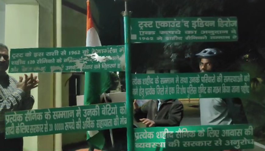 अभिषेक यादव ने भारत यात्रा के दौरान शहीद सैनिकों के परिवार वालों के लिए संक्षिप्त बोर्ड पर मांगें अपने शब्दों में लिखीं हैं