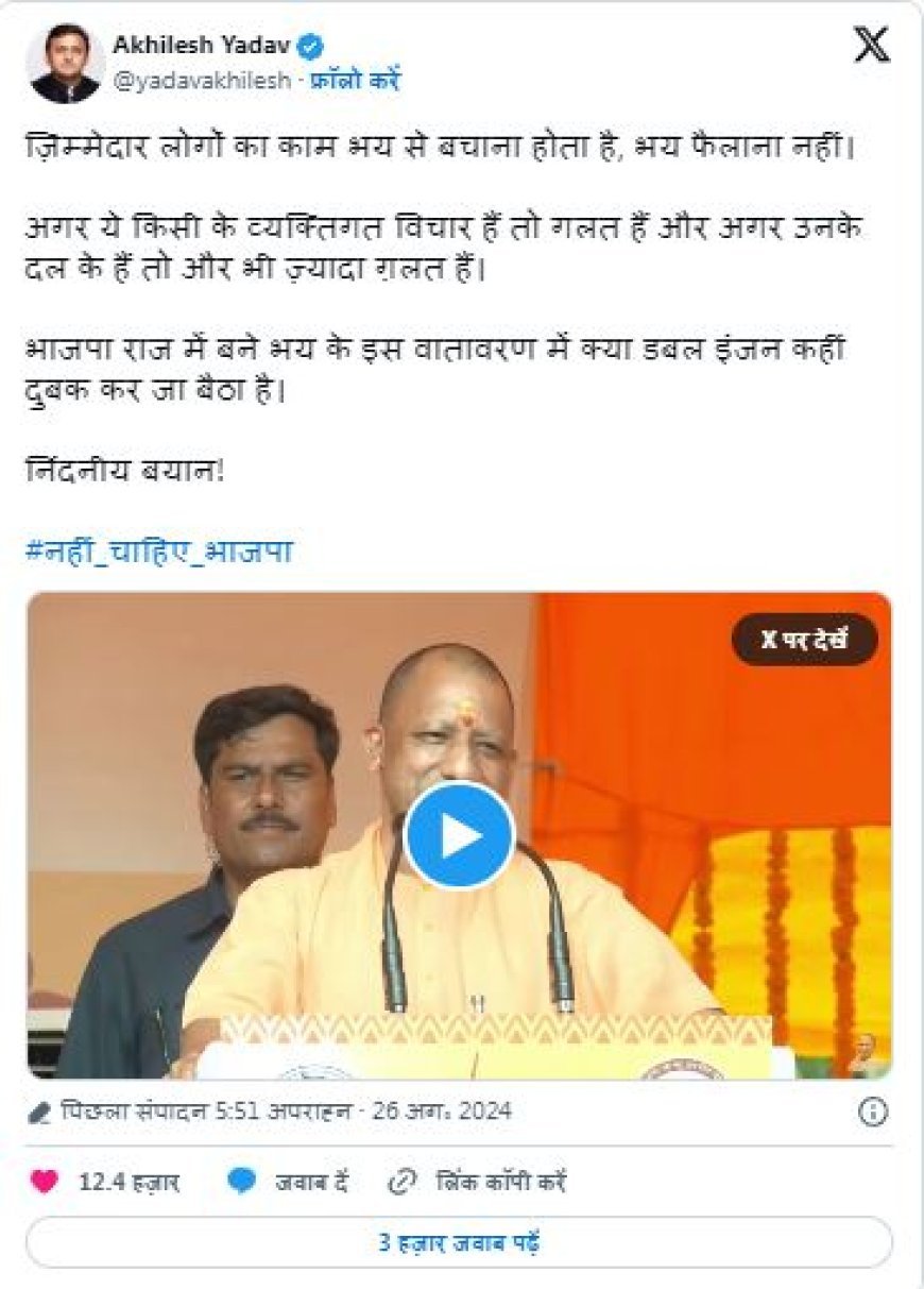 उन्होंने लिखा था कि जिम्मेदार लोगों का काम भय से बचाना होता है, भय फैलाना नहीं। उन्होंने कहा था, ‘अगर ये किसी के व्यक्तिगत विचार हैं तो गलत हैं और अगर उनके दल के हैं तो और भी ज्यादा गलत हैं। भारतीय जनता पार्टी के राज में बने भय के इस वातावरण में क्या डबल इंजन कहीं दुबक कर जा बैठा है।’ कल्कि पीठाधीश्वर आचार्य प्रमोद कृष्णम ने मुख्यमंत्री योगी आदित्यनाथ के उस बयान का समर्थन किया है जिसमें योगी आदित्यनाथ कह रहे हैं कि ‘बंटेंगे तो कटेंगे’। आचार्य ने कहा कि जब तक सनातन ताकतवर है तब तक भारत ताकतवर है। उन्होंने कहा कि अगर सनातन बंटा तो भारत भी बंटेगा क्योंकि, सनातन और भारत को अलग नहीं किया जा सकता। बता दें कि उत्तर प्रदेश के मुख्यमंत्री योगी आदित्यनाथ ने हाल में एक कार्यक्रम के दौरान कहा था, बांग्लादेश से सबक सीखिए, एक रहना है, बंटना नहीं है। उन्होंने कहा था कि बंटेंगे तो कटेंगे और एक रहेंगे तो सुरक्षित रहेंगे।