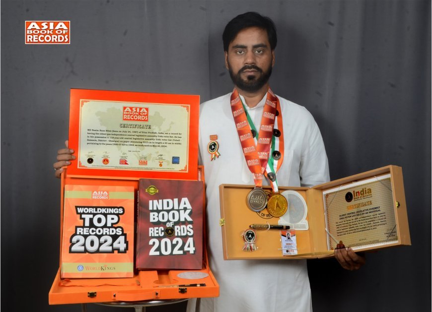 भारत में ऐसे दुर्लभ बचे हुए 118 वर्षीय एकमात्र उर्दू भाषा में प्रकाशित मतदाता सूची को एशिया बुक ऑफ रिकॉर्ड्स-2024 ने मुहम्मद नसीम रज़ा ख़ाँ का नाम दर्ज कर सर्टिफिकेट, मेडल, पेन, बैज गाड़ी स्टीकर एवं एशिया बुक ऑफ रिकॉर्ड्स-2024 की पुस्तक प्रदान कर सम्मानित किया।