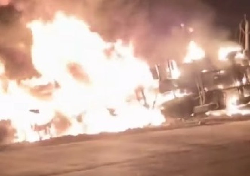 हाईवे पर मोबिल ऑयल टैंकर बना आग का गोला, बिजली के खंभे से टकराकर पलटा टैंकर, लपटें 100 फीट ऊंची उठीं।
