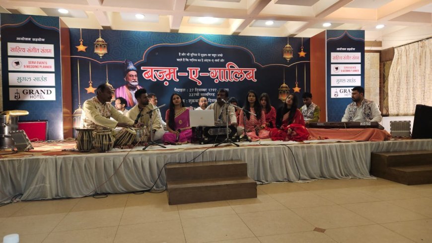 अंतरराष्ट्रीय ख्याति प्राप्त गायक सुधीर नारायण ने और उनके साथ कीर्तिका नारायण, श्रेया शर्मा, प्रीति, राधा तोमर, खुशी, देशदीप, अमन, रिंकू और हर्षित पाठक ने मिर्ज़ा ग़ालिब की कई लोकप्रिय गजलों को प्रस्तुत किया। प्रारंभ हुआ हज़ारों ख्वाहिशें ऐसी की हर ख्वाहिश पे दम निकले इस ग़ज़ल से, कृतिका के स्वर थे नुक्ताचीं है गमें दिल। श्रेया ने सुनाया ना कुछ था कुछ तो खुदा था और फिर सभी ने समवेत स्वर में प्रस्तुत किया, कोई उम्मीद वर नहीं आती कोई सूरत नजर नहीं आती। सुशील सरित ने संचालन करते हुए कहा एहसास ए तबस्सुम ग़ालिब है ख्वाबों का इशारा ग़ालिब है दुनिया में दूसरी दुनिया का भरपूर नज़ारा र ग़ालिब है। इस अवसर पर हरीश अग्रवाल, हरीश भदोरिया, डॉक्टर रमेश आनंद, करनल शिव कुंजरू, ज्योति खंडेलवाल, अनिल शर्मा, ओ पी सरीन, मीरा सरीन, विशाल रियाज, हेमा शर्मा, देव, राम कुमार अग्रवाल, नीरज जैन, दिनेश श्रीवास्तव, अमीर अहमद, महेश धाकड़, अनिल शर्मा, विक्रम शुक्ला, अमीर अहमद, अनिल डांग और आरिफ तैमूरी आदि मौजूद रहे। सुधीर नारायण ने धन्यवाद ज्ञापित किया।
