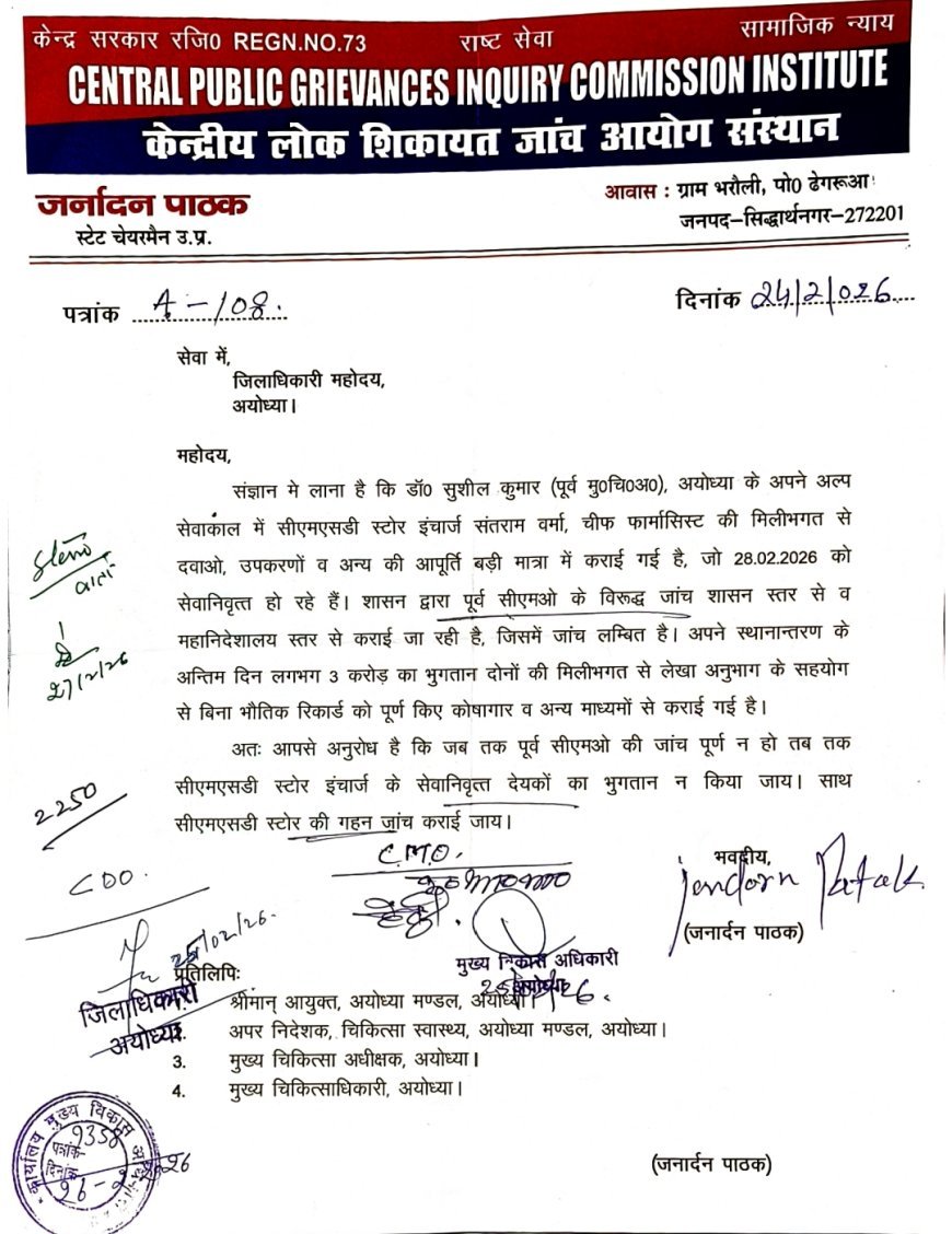 अयोध्या जिले के स्वास्थ्य विभाग में बड़े पैमाने पर अनियमितता का मामला सामने आया है। पूर्व मुख्य चिकित्सा अधिकारी सुशील कुमार बानियान के कार्यकाल में करीब तीन करोड़ रुपये की दवाइयों, उपकरणों और अन्य सामग्री का भुगतान बिना किसी भौतिक जांच या सत्यापन के कोषागार से करा लिया गया। यह भुगतान तब किया गया जब सीएमओ का तबादला होने वाला था और रिकॉर्ड अधूरे थे। सूत्रों के अनुसार इस मामले में सीएमएसडी स्टोर इंचार्ज संतराम मुख्य भूमिका में बताए जा रहे हैं। लेखा अनुभाग की मिलीभगत से अधूरे कागजों के आधार पर भुगतान पास कराया गया। स्टॉक का मिलान नहीं हुआ, सत्यापन नहीं हुआ और जवाबदेही भी तय नहीं की गई। सिर्फ फाइलें चलाई गईं और सरकारी खजाने से पैसा निकल गया।