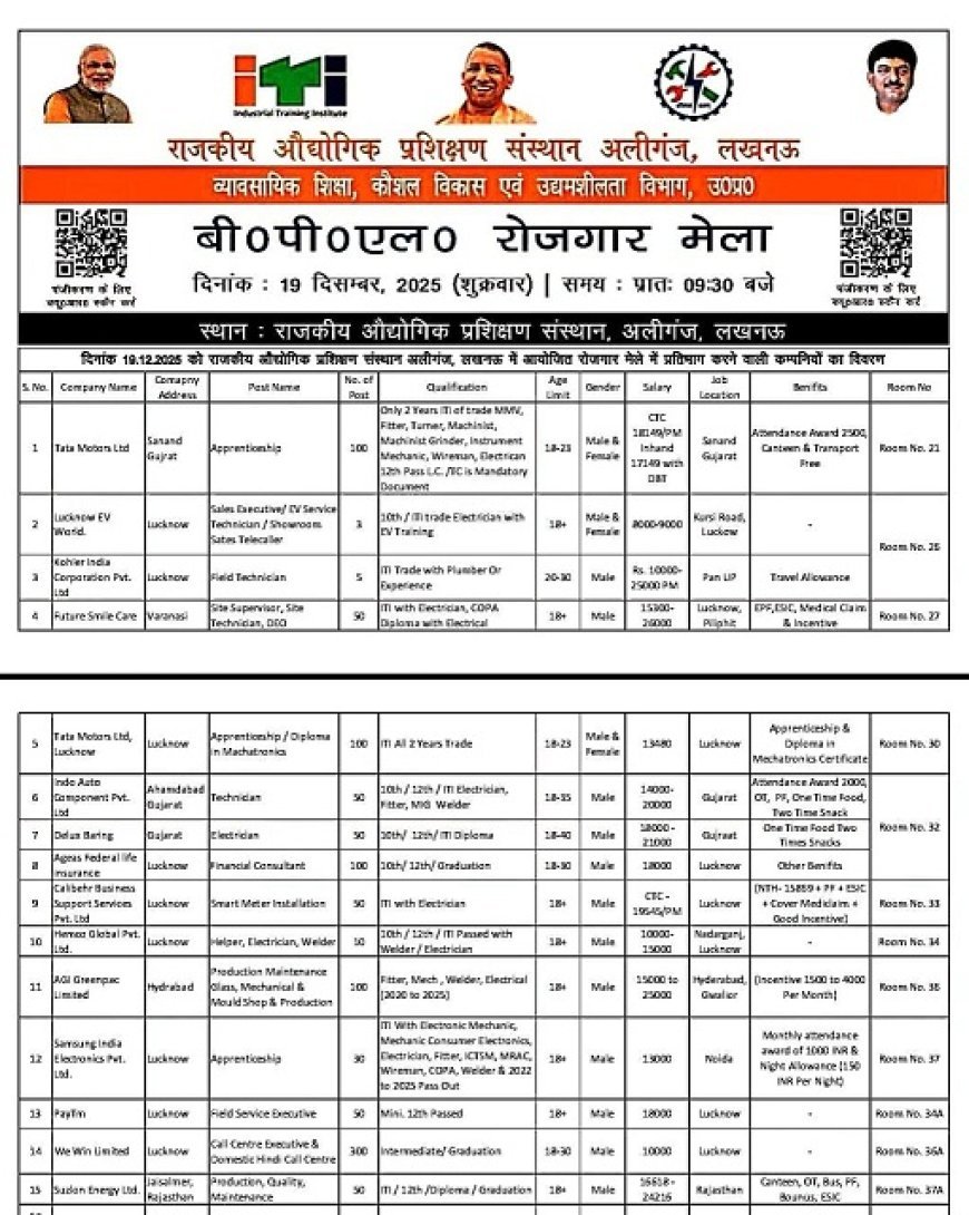 उन्होंने बताया कि इच्छुक अभ्यर्थियों को 19 दिसंबर, 2025 को अपने समस्त शैक्षणिक एवं तकनीकी प्रमाण पत्रों के साथ राजकीय आईटीआई अलीगंज, लखनऊ में समय से उपस्थित होना अनिवार्य होगा। प्रदेश सरकार की इस पहल से युवाओं को स्थानीय स्तर पर रोजगार के बेहतर अवसर प्राप्त होंगे और आत्मनिर्भर उत्तर प्रदेश के संकल्प को मजबूती मिलेगी।