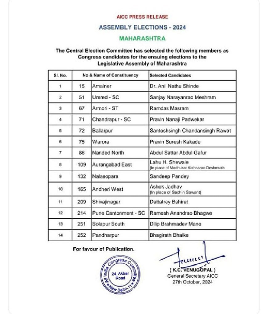 Congress releases another list of 14 candidates for the upcoming #MaharashtraAssemblyElections2024