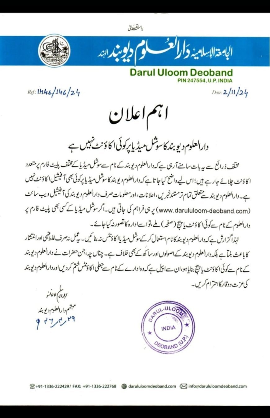 जबकि दारुल उलूम का सोशल प्लेटफार्म पर कोई भी आधिकारिक अकाउंट नहीं है।