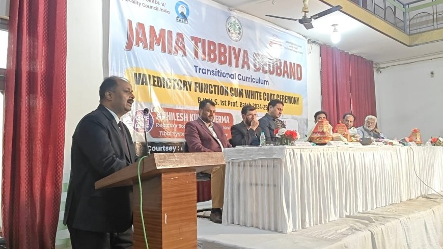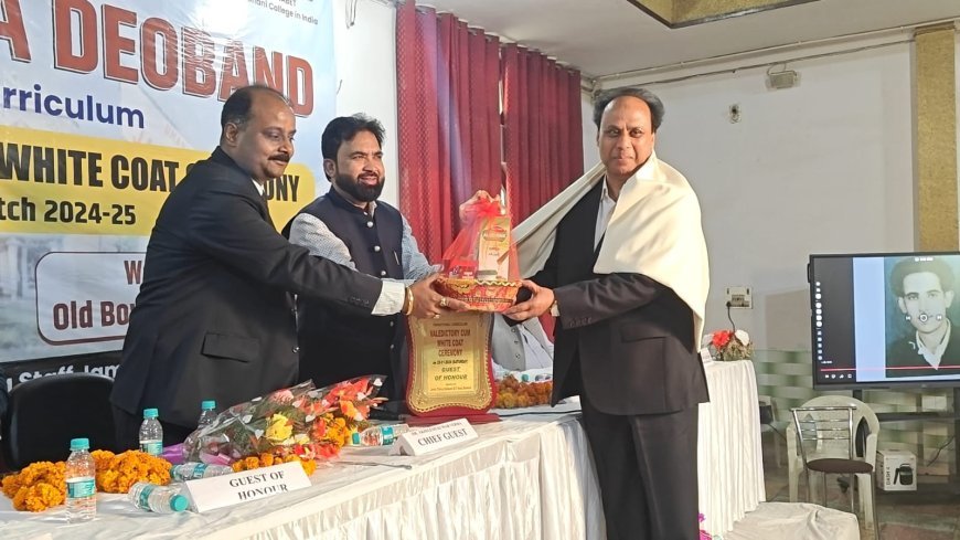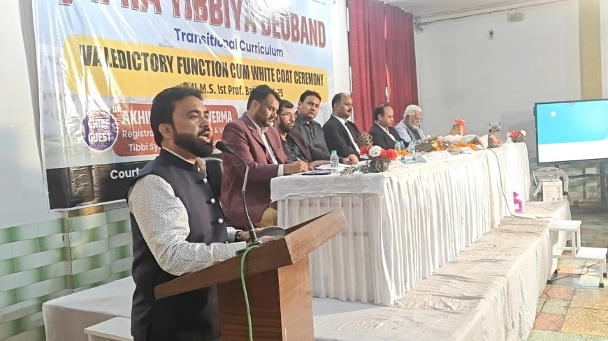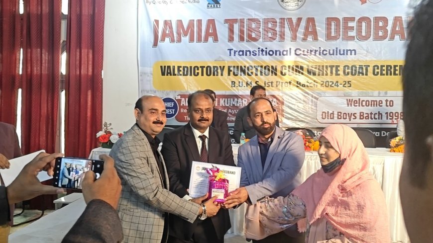 जामिया तिब्बिया देवबन्द में सत्र 2024-25 हेतु इंडक्शन प्रोग्राम का वेलीडिक्टरी फक्शन कम व्हाइट कोट सेरेमनी का आयोजन आज किया गया। जिसमें नव प्रवेशित बी0यू0एम0एस0 प्रथम वर्ष के छात्र व छात्राओं की कक्षाओं का इंडक्शन प्रोग्राम का समापन एन0सी0आई0एस0एम0 नई दिल्ली के निर्देशानुसार किया गया। इस अवसर पर कार्यक्रम के मुख्य अतिथि, आयुर्वेदिक तथा यूनानी तिब्बिी चिकित्सा पद्धति बोर्ड, उ0प्र0, लखनऊ के रजिस्ट्रार, डा0 अखिलेश कुमार वर्मा रहे।