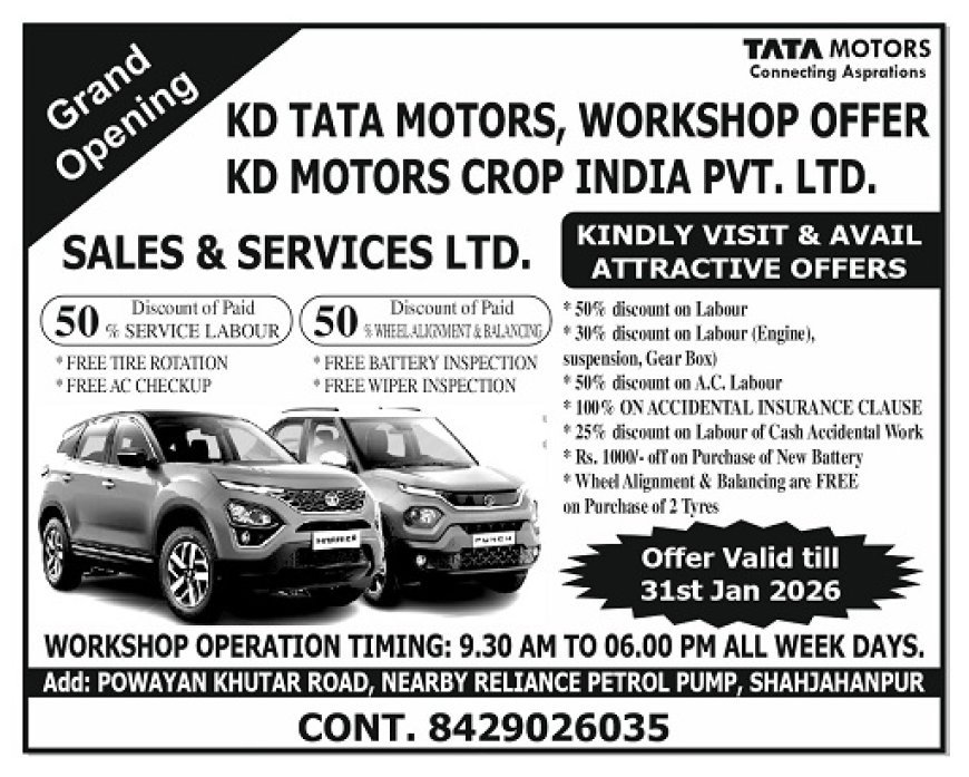 इसके अतिरिक्त इंजन, सस्पेंशन व गियर बॉक्स लेबर पर 30 प्रतिशत की छूट, एसी लेबर पर 50 प्रतिशत की छूट, नई बैटरी खरीद पर ₹1000 की विशेष छूट तथा दो टायर खरीदने पर व्हील एलाइनमेंट एवं बैलेंसिंग पूरी तरह निःशुल्क दी जाएगी। दुर्घटनाग्रस्त वाहनों के बीमा क्लेम कार्यों पर भी विशेष लाभ प्रदान किए जाएंगे।वर्कशॉप का संचालन प्रतिदिन सुबह 9:30 बजे से शाम 6:00 बजे तक किया जाएगा। यह विशेष ऑफर 31 जनवरी 2026 तक मान्य रहेगा।
