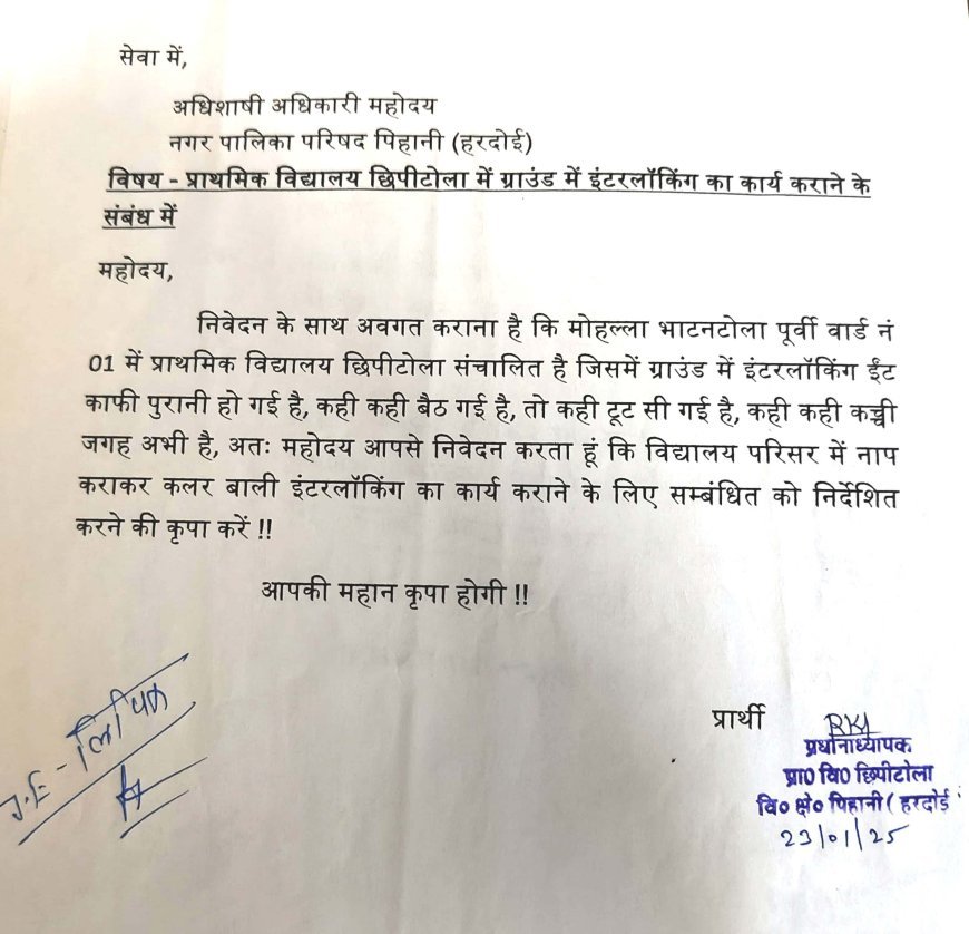 प्राथमिक विद्यालय छीपीटोला के प्रधानाध्यापक ने 23 जनवरी 2025 को नगर पालिका के अधिशासी अधिकारी को एक पत्र लिखा था, जिसमें उन्होंने उल्लेख किया कि विद्यालय परिसर में लगी इंटरलॉकिंग ईंटें पुरानी और खराब हो चुकी हैं। कई जगह ईंटें टूट गई हैं या जमीन में धंस गई हैं, जिससे बच्चों को असुविधा हो रही है। उन्होंने अधिशासी अधिकारी से अनुरोध किया था कि विद्यालय में नई रंगीन इंटरलॉकिंग का कार्य कराया जाए।