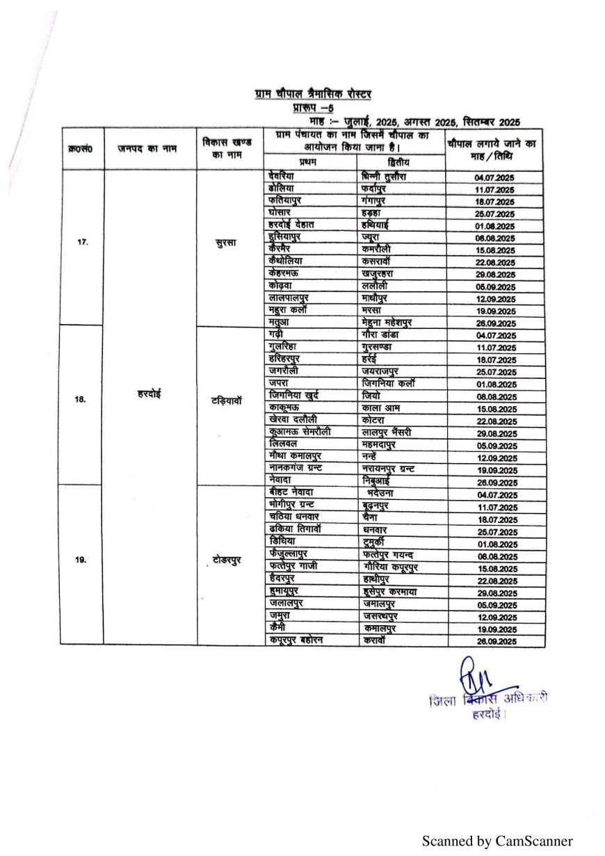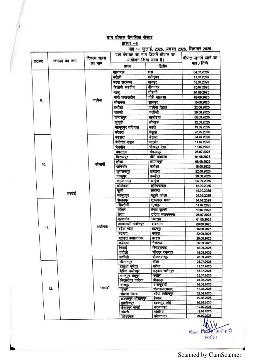 हरदोई : उत्तर प्रदेश सरकार के शासनादेश संख्या आर-351/38-1-2022-3551/2022, दिनांक 29 दिसंबर 2022 के तहत हरदोई जिले में ग्राम चौपाल के आयोजन के लिए अगस्त 2025 का मासिक रोस्टर जारी किया गया है।