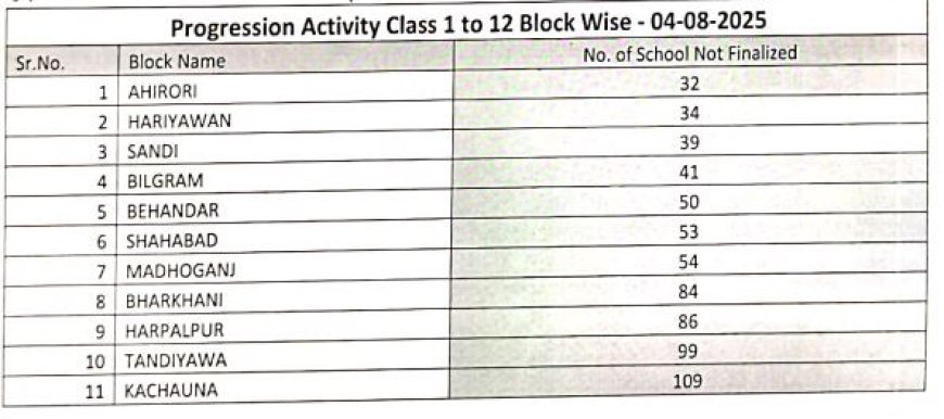 26 जुलाई 2025 के पत्र में जिला प्रशासन ने तीन दिनों में यह कार्य पूरा करने का निर्देश दिया था। यू-डायस पोर्टल की 4 अगस्त 2025 की रिपोर्ट के अनुसार, निम्नलिखित विकासखंडों में स्कूलों की संख्या, जिन्होंने प्रोग्रेशन गतिविधि को अंतिम रूप नहीं दिया, इस प्रकार है: