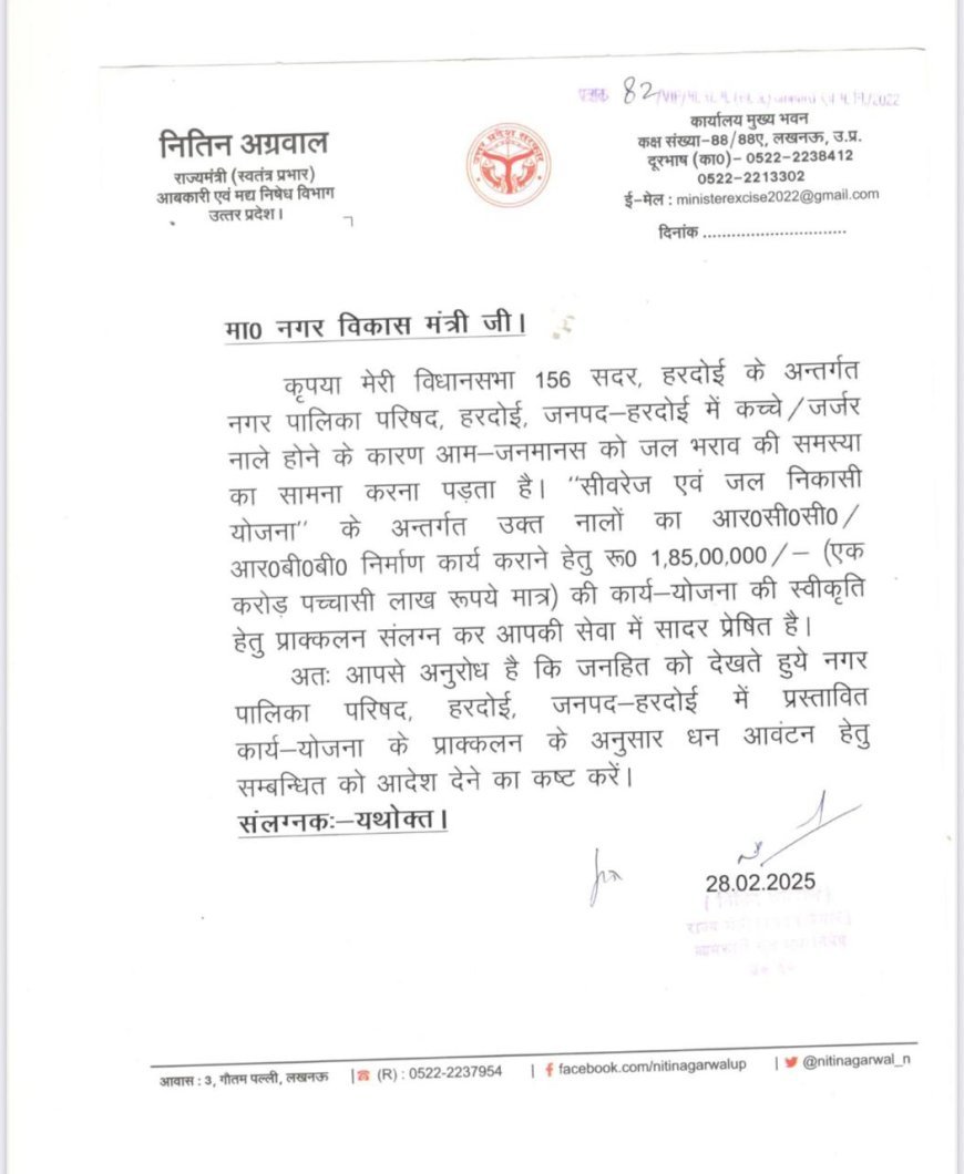 Hardoi : विकास परियोजनाओं को मंजूरी, आबकारी मंत्री नितिन अग्रवाल ने जताया मुख्यमंत्री और नगर विकास मंत्री का आभार