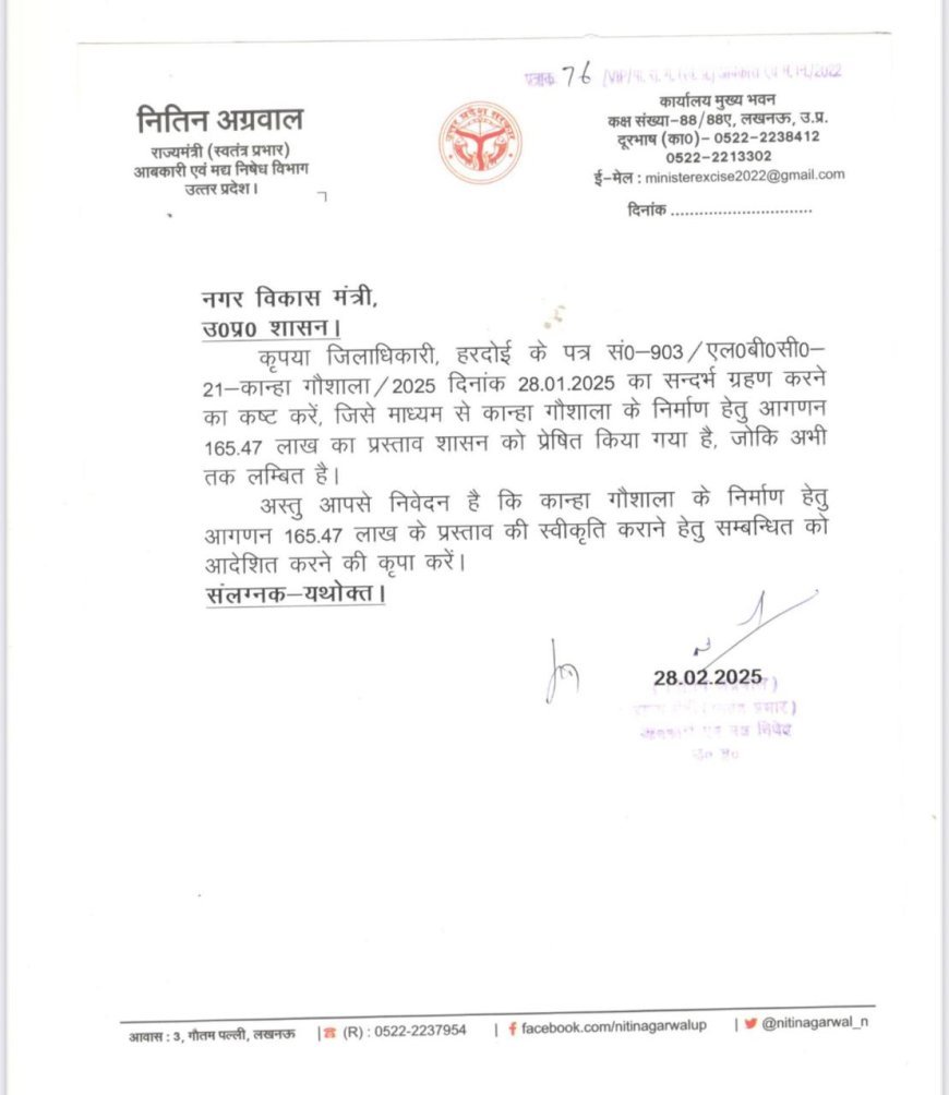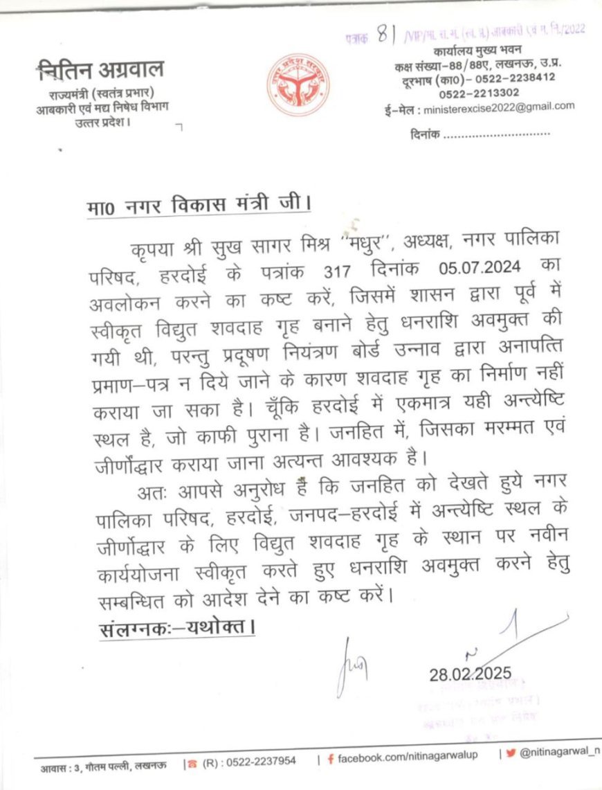 नितिन अग्रवाल ने बताया कि उनके अनुरोध पर नगर पालिका परिषद, हरदोई में विद्युत शवदाह गृह के निर्माण के लिए 3 करोड़ रुपये, कान्हा गौशाला के लिए 1.65 करोड़