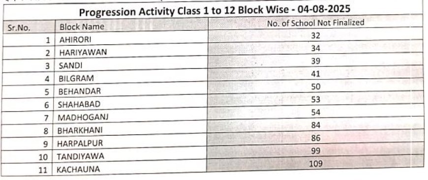 हरदोई : स्कूल शिक्षा निदेशालय ने हरदोई जिले के कछौना, टडियावां, हरपालपुर, भरखनी, माधौगंज, शाहाबाद, बेंहदर, बिलग्राम, सांडी, हरियावां और अहिरोरी विकासखंडों के खंड शिक्षा अधिकारियों को यू-डायस 2025-26 के लिए छात्र प्रोफाइल में प्रोग्रेशन गतिविधि को शत-प्रतिशत पूरा करने और स्कूल डेटा को अंतिम रूप देने का निर्देश दिया है।