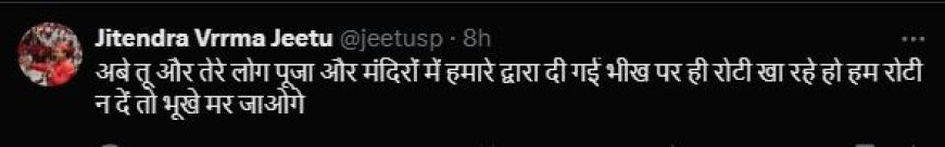 जिसके जबाव में पूर्व सपा जिलाध्यक्ष जितेंद्र वर्मा जीतू ने लिखा कि "अबे तू और तेरे लोग पूजा और मंदिरों में हमारे द्वारा दी गई भीख पर ही रोटी खा रहे हो हम रोटी न दें तो भूखे मर जाओगे"