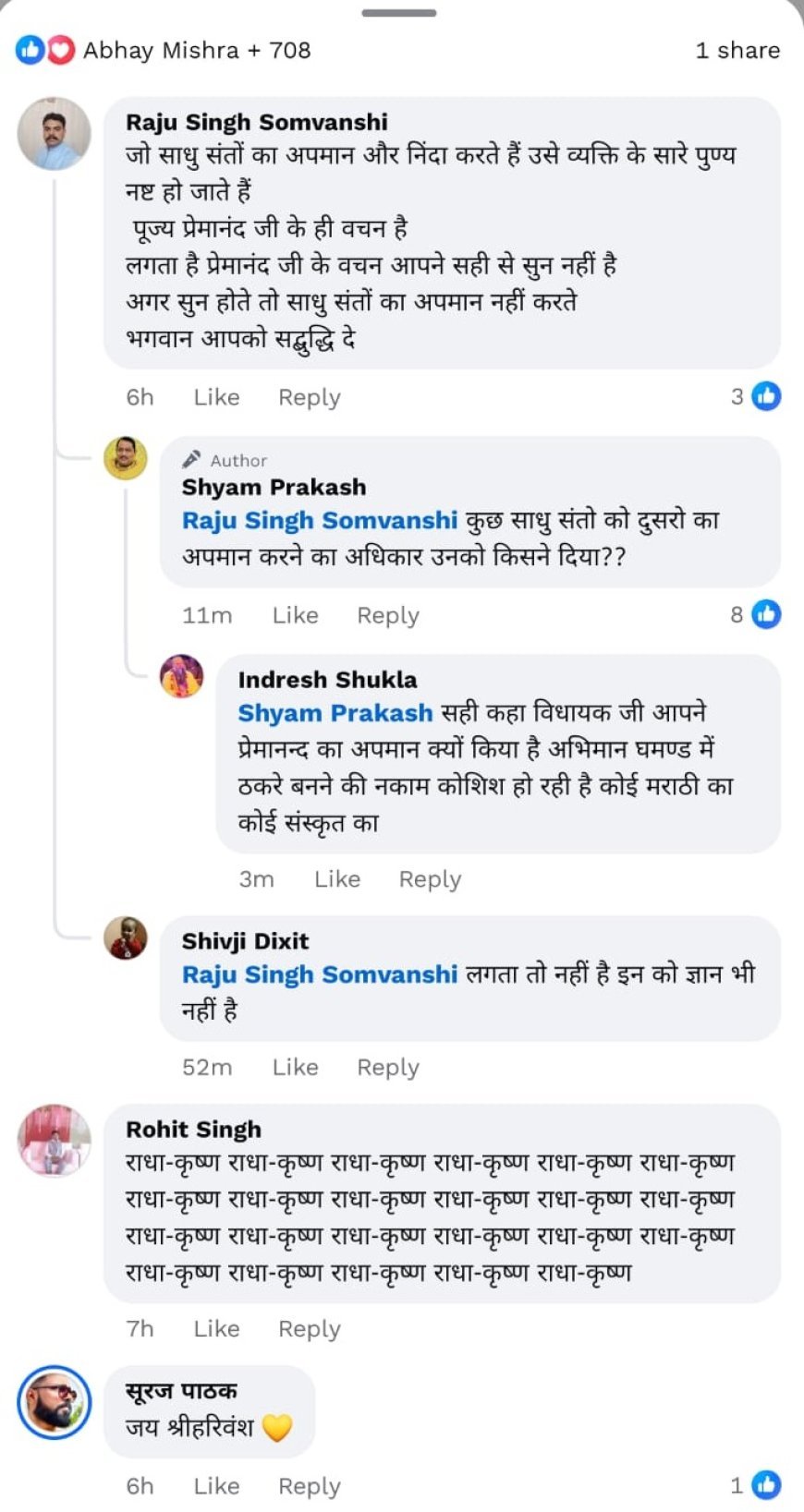 राजू सिंह सोमनवंशी ने लिखा – “जो साधु संतों का अपमान और निंदा करते हैं उसे व्यक्ति के सारे पुण्य नष्ट हो जाते हैं। पूज्य प्रेमानंद जी के ही वचन हैं, लगता है प्रेमा