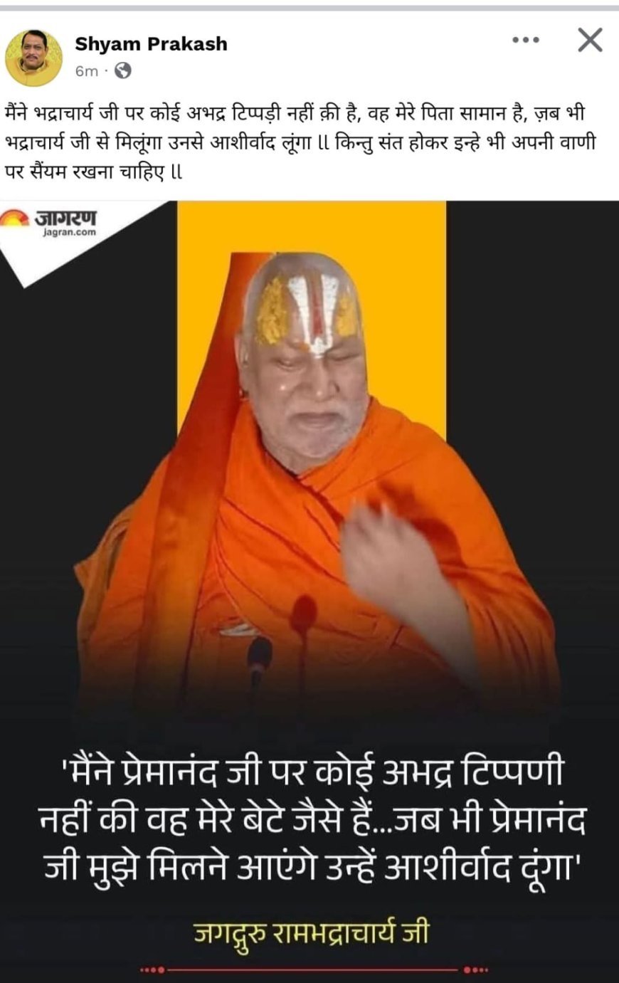 बहरहाल, हाल ही में जगतगुरु रामभद्राचार्य जी द्वारा प्रेमानंद महाराज और ब्राह्मण समाज के प्रति की गई टिप्पणी को लेकर संत समुदाय और अनुयायियों में नाराजगी देखी गई थी। इसके बाद विधायक श्याम प्रकाश ने सोशल मीडिया पर प्रतिक्रिया दी थी। अब उन्होंने अपने ताजा पोस्ट के जरिए यह संदेश देने की कोशिश की है कि वे व्यक्तिगत तौर पर किसी भी संत के खिलाफ नहीं हैं और सभी संतों का सम्मान करते हैं।