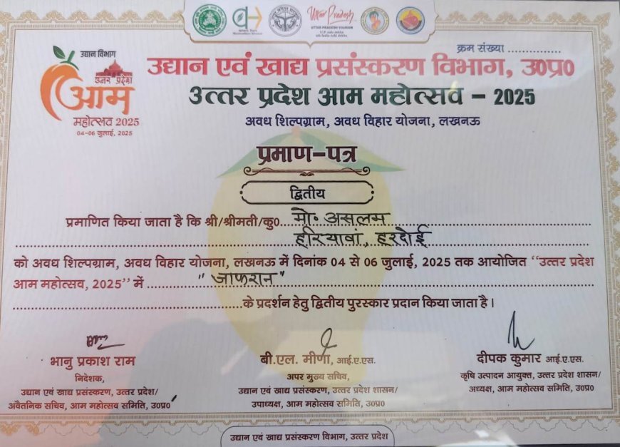 लखनऊ के अवध शिल्पग्राम में 4 से 6 जुलाई 2025 तक आयोजित तीन दिवसीय उत्तर प्रदेश आम महोत्सव 2025 के समापन समारोह में हरदोई जिले के हरियावां निवासी किसान असलम को उनके जाफरान आम के उत्कृष्ट प्रदर्शन के लिए प्रदेश भर में दूसरा स्थान प्राप्त हुआ। उद्यान एवं खाद्य प्रसंस्करण विभाग द्वारा आयोजित इस महोत्सव में असलम को उनके योगदान के लिए प्रमाण पत्र प्रदान किया गया। समापन समारोह में कृषि विपणन राज्य मंत्री दिनेश प्रताप सिंह ने असलम को सम्मानित किया, जिसने हरदोई जिले का नाम रोशन किया।