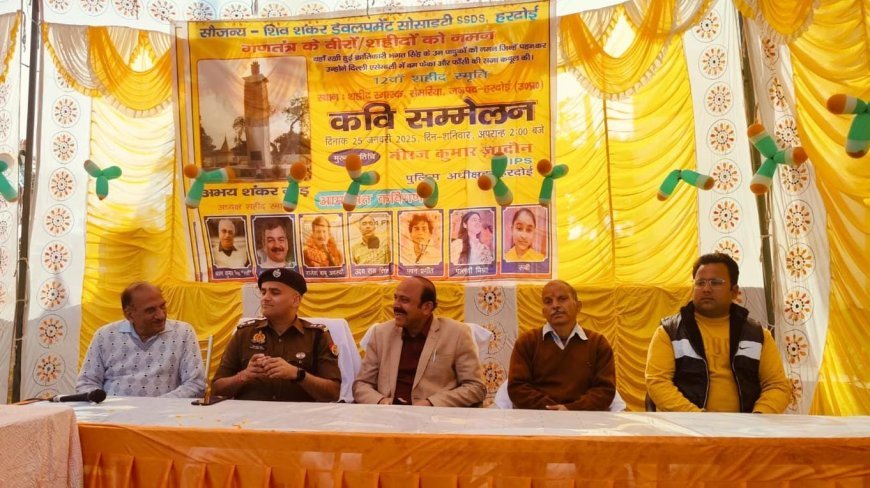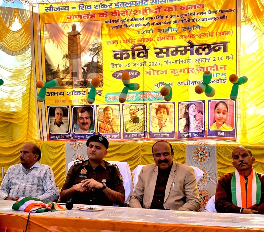 गणतंत्र दिवस(Republic Day) की पूर्व संध्या पर शहीद स्मारक सिमरिया हरपालपुर हरदोई में 12वां कवि सम्मेलन आयोजित किया गया इस कवि सम्मेलन में वीर, ओज कवियों ने अपनी जोशीली कविताएं प्रस्तुत की। इस कार्यक्रम का मुख्य आकर्षण है रहे क्रांतिकारी भगत सिंह के वह जूते जिन्हें पहनकर क्रांतिकारी भगत सिंह ने दिल्ली असेंबली में बम फेंका और देश को आजाद करने के लिए फांसी की सजा कबूल की, हरदोई के पुलिस अधीक्षक नीरज कुमार जादौन ने उन जूते पर माल्यार्पण किया और एक सैल्यूट भगत सिंह के उन जूते को दिया।