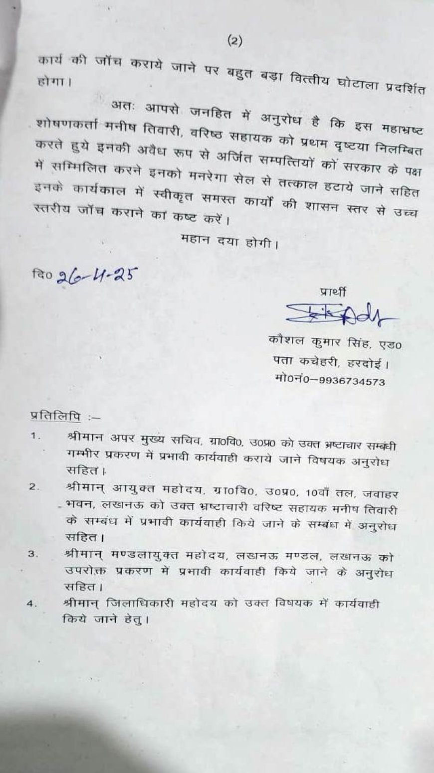 हरदोई: उत्तर प्रदेश के हरदोई जिले में महात्मा गांधी राष्ट्रीय ग्रामीण रोजगार गारंटी अधिनियम (मनरेगा) से संबंधित कार्यों में बड़े पैमाने पर वित्तीय अनियमितताओं का मामला प्रकाश में आया है। ग्राम्य विकास विभाग में कार्यरत वरिष्ठ सहायक मनीष तिवारी (Manish Tiwari) पर भ्रष्टाचार और नियमों के उल्लंघन के गंभीर आरोप लगे हैं। अधिवक्ता कौशल कुमार सिंह (Kaushal Kumar Singh) ने इस मामले को उजागर करते हुए उपमुख्यमंत्री, अपर मुख्य सचिव (ग्राम्य विकास विभाग), आयुक्त, और अन्य वरिष्ठ अधिकारियों को शिकायती पत्र भेजकर तिवारी के तत्काल निलंबन और उच्च स्तरीय जांच की मांग की है।