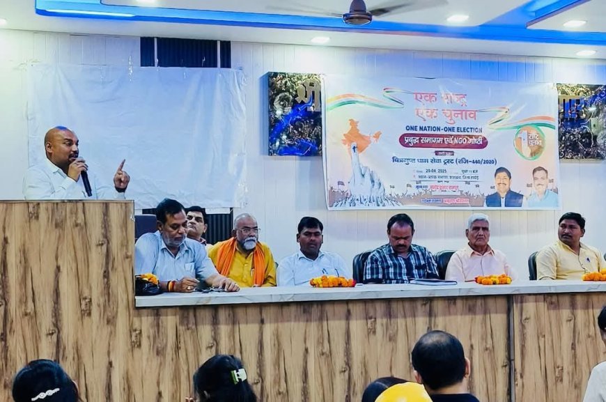 हरदोई: चित्र गुप्त सेवा धाम ट्रस्ट द्वारा ब्लॉक सभागार शाहाबाद में आयोजित "एक राष्ट्र एक चुनाव" विषयक परिचर्चा में भाजपा के जिला महामंत्री सत्येन्द्र कुमार सिंह राजपूत ने कहा कि "एक राष्ट्र, एक चुनाव" एक ऐसी अवधारणा है जिसका उद्देश्य भारत में लोकसभा और राज्य विधानसभा चुनावों को एक साथ कराना है। बार-बार चुनाव कराने से सरकार और राजनीतिक दलों को बहुत खर्च करना पड़ता है।