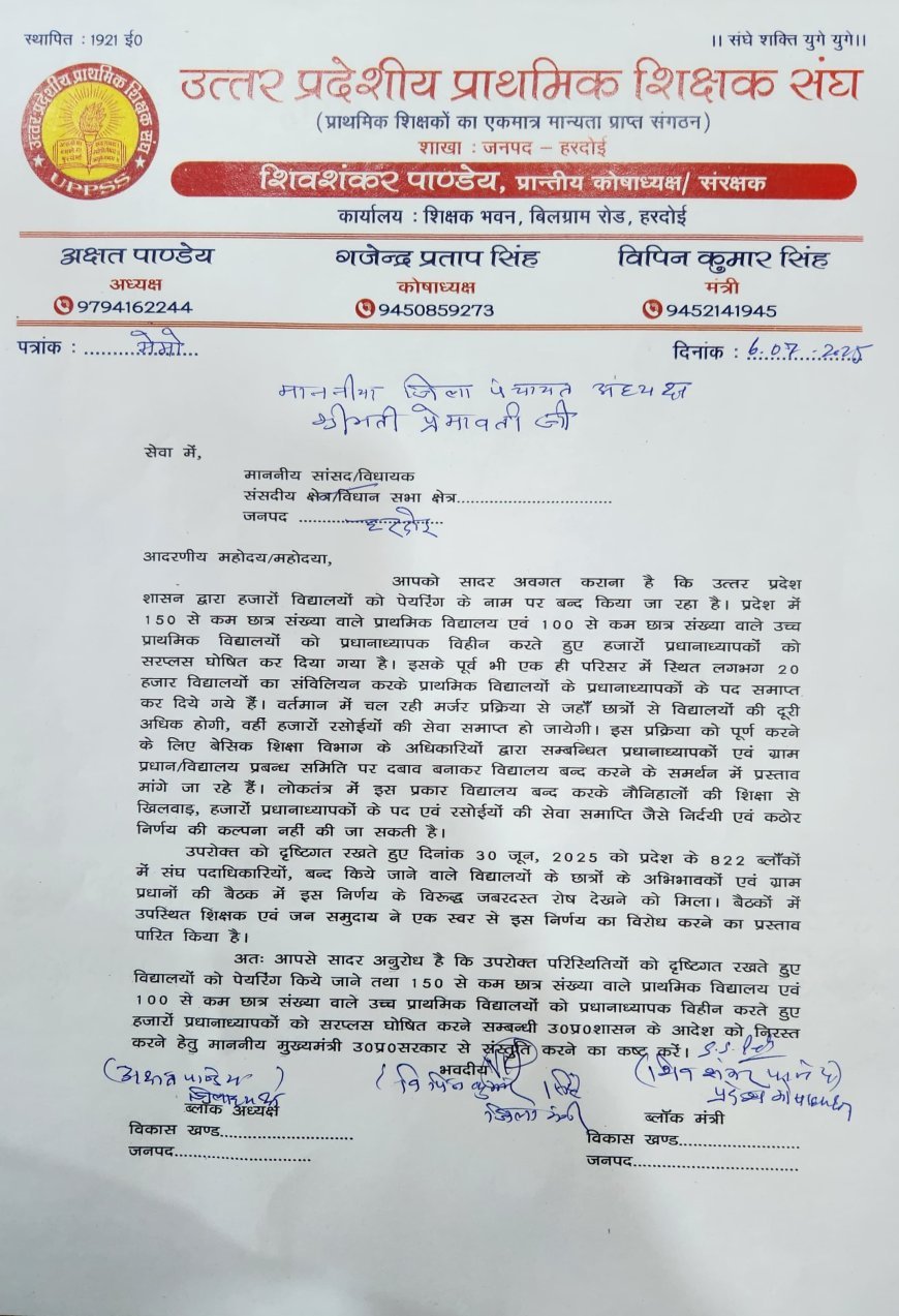 हरदोई : उत्तर प्रदेशीय प्राथमिक शिक्षक संघ ने बेसिक शिक्षा विभाग द्वारा स्कूलों के मर्जर के फैसले का कड़ा विरोध जताया। संघ की जिला कार्यसमिति के प्रतिनिधिमंडल ने प्रदेश कोषाध्यक्ष शिवशंकर पांडेय के नेतृत्व में जिला पंचायत अध्यक्ष प्रेमावती पीके वर्मा को जिला पंचायत कार्यालय में मुख्यमंत्री के नाम एक ज्ञापन सौंपा। इस ज्ञापन में स्कूल मर्जर की नीति को अव्यवहारिक और संवेदनहीन बताते हुए इसे तत्काल रद्द करने की मांग की गई।