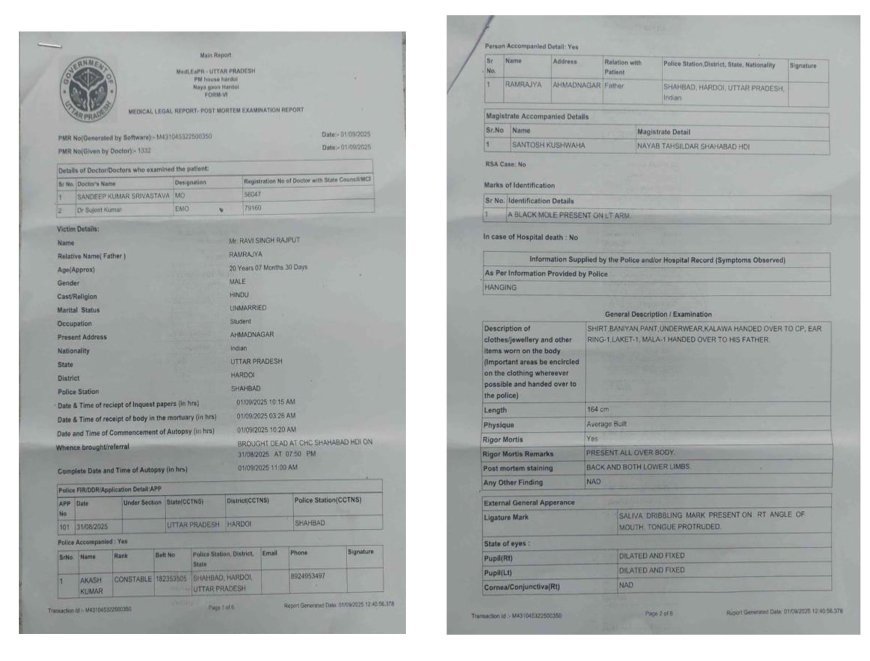 Hardoi : पुलिस हिरासत में मृत युवक की पोस्टमार्टम रिपोर्ट में 'श्वासावरोध के कारण फांसी' की पुष्टि, जांच जारी