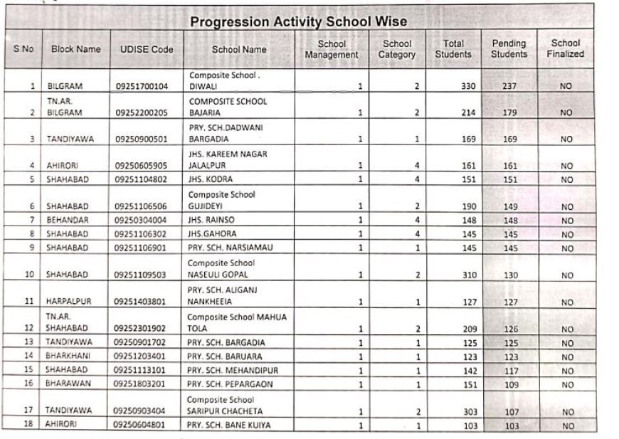 इस कार्य को 15 दिनों के भीतर पूरा करने का निर्देश था, और खंड शिक्षा अधिकारियों के माध्यम से समय-समय पर इसके लिए निर्देश दिए गए। इसके बावजूद, कई स्कूलों ने छात्र प्रोफाइल में प्रोग्रेशन गतिविधि को पूरी तरह से अपडेट और अंतिम रूप नहीं दिया। 26 जुलाई 2025 के पत्र के माध्यम से जिला प्रशासन ने सभी स्कूलों को यह कार्य तीन दिनों में पूरा करने का निर्देश दिया था, लेकिन 4 अगस्त 2025 को यू-डायस पोर्टल की रिपोर्ट के अनुसार, कई स्कूलों ने अभी तक यह कार्य पूरा नहीं किया है।