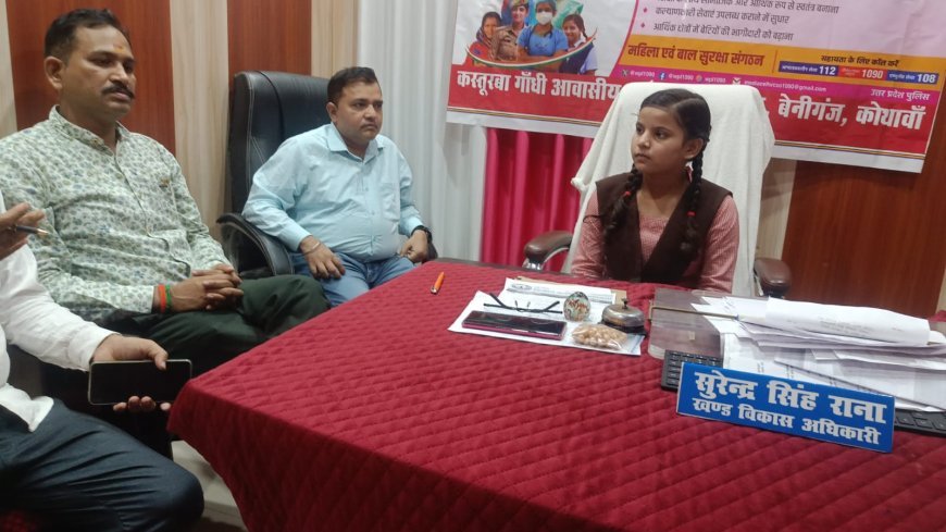 कोथावां (हरदोई) : कस्तूरबा गांधी आवासीय विद्यालय, बेनीगंज की सातवीं कक्षा की छात्रा यशी सिंह ने एक दिन के लिए विकास खंड कोथावां की खंड विकास अधिकारी (बीडीओ) की जिम्मेदारी संभाली। ग्राम फरेंदा की रहने वाली यशी ने इस दौरान ग्रामीणों की समस्याओं का समाधान किया।