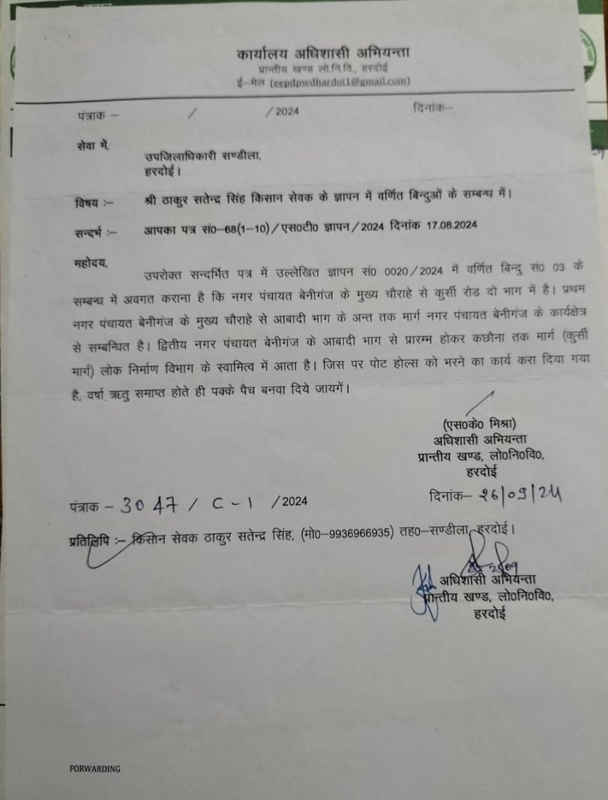 भारतीय किसान यूनियन सावित्री से जिला प्रभारी हरदोई ठाकुर सत्येंद्र सिंह जैसा की 4 वर्षों से निरंतर तहसील के अंतर्गत ग्राम पंचायत झरोइया में चकरोड पर बनी दीवार जो चर्चा का विषय है जिन्होंने बताया कि वह हरदोई में बैठे जिम्मेदार अधिकारियों से निवेदन करते हैं कि एक बार मौके पर आकर नक्शे के अनुसार पैमाईश करवाए और अगर वह दीवार चक मार्ग पर नहीं मिलती है तो उन्हें और राजस्व के उस लेखपाल को जिसने लोगों के मन में भ्रम उत्पन्न किया दोनों लोगों को जेल भेजने का कार्य किया जाए अन्यथा की स्थिति में उस चक रोड पर बनी दीवार को हटवाया जाए।