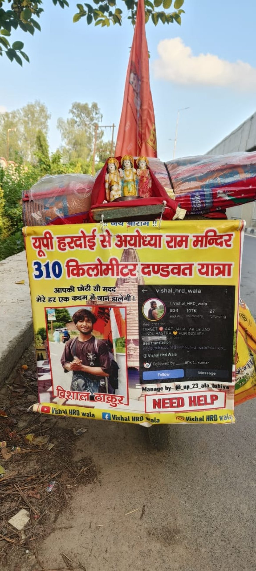 विशाल ठाकुर ने बताया कि उनकी यह दंडवत यात्रा मानव कल्याण के उद्देश्य से की जा रही है। वे प्रतिदिन लगभग 3 से 4 किलोमीटर की दूरी दंडवत प्रणाम करते हुए