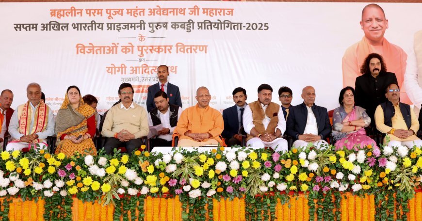 मुख्यमंत्री आज जनपद गोरखपुर में ब्रह्मलीन परमपूज्य महन्त अवेद्यनाथ महाराज सप्तम अखिल भारतीय प्राइजमनी पुरुष कबड्डी प्रतियोगिता-2025 के पुरस्कार वितरण कार्यक्रम में अपने विचार व्यक्त कर रहे थे। उन्होंने प्रतियोगिता की विजेता उत्तर प्रदेश टीम को 02 लाख रुपये का चेक तथा ट्रॉफी एवं उपविजेता पूर्वात्तर रेलवे टीम को 01 लाख रुपये का चेक व ट्रॉफी प्रदान की।