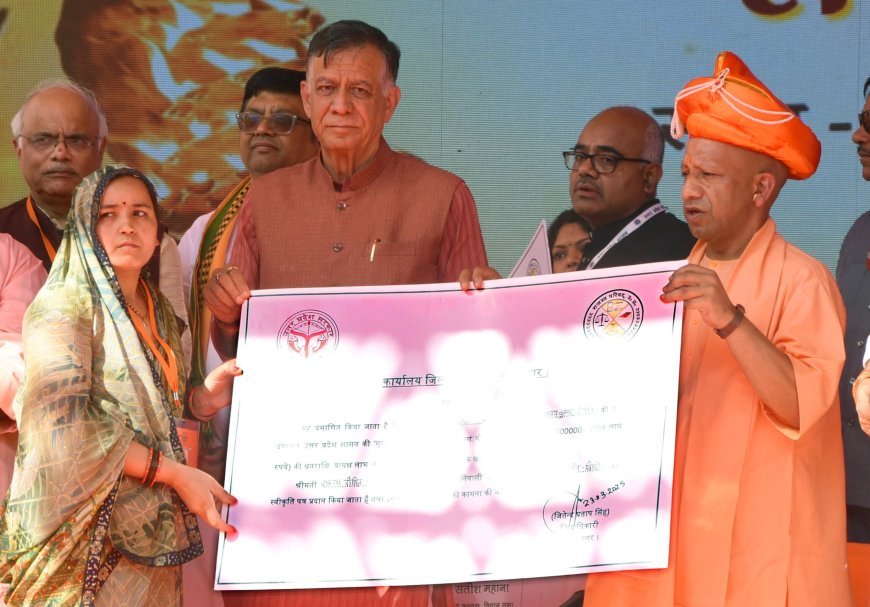 CM योगी (Yogi) आदित्यनाथ के हाथों विवेक यादव, सूरज कुमार, साबिया शेख, मनीषा कुशवाहा, प्रशांत सिंह को CM युवा उद्यमी विकास अभियान का चेक, आंगनबाड़ी कार्यकत्री ज्योति देवी, नीलम गौतम, प्रीति सोनवानी, सोनम कुशवाहा, सपना देवी को नियुक्ति पत्र, CM कृषक दुर्घटना कल्याण योजना के तहत संध्या दीक्षित, बीना देवी, राजरानी, सुषमा व रामसजीवन को स्वीकृति पत्र दिया गया।