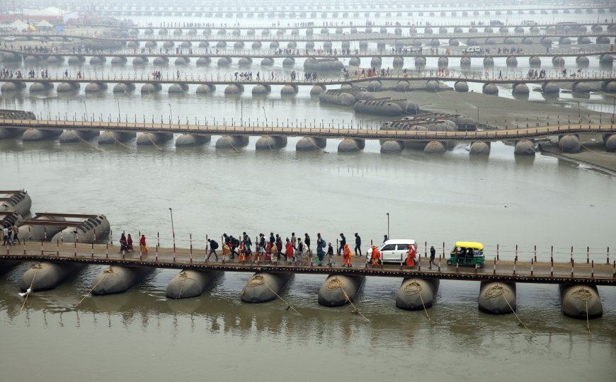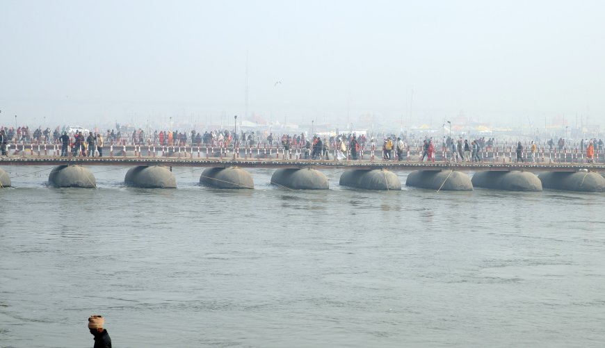 गंगा नदी पर 30 पीपे के पुलों का निर्माण Maha Kumbh में अब तक का सबसे बड़ा कार्य है। मेले के समापन के बाद इन पुलों को हटाकर अन्य स्थानों पर संग्रहीत कर दिया जाएगा। "मजबूत लोहे की चादरों से बने खोखले पांटून को क्रेन की मदद से नदी में उतारा जाता है।