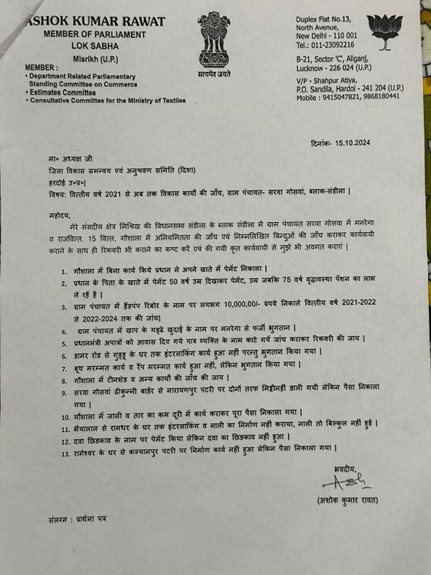 Hardoi News: सण्डीला के सरवा गोसवा ग्राम प्रधान के विरुद्ध सांसद अशोक रावत ने कार्यवाई को लिखा पत्र।