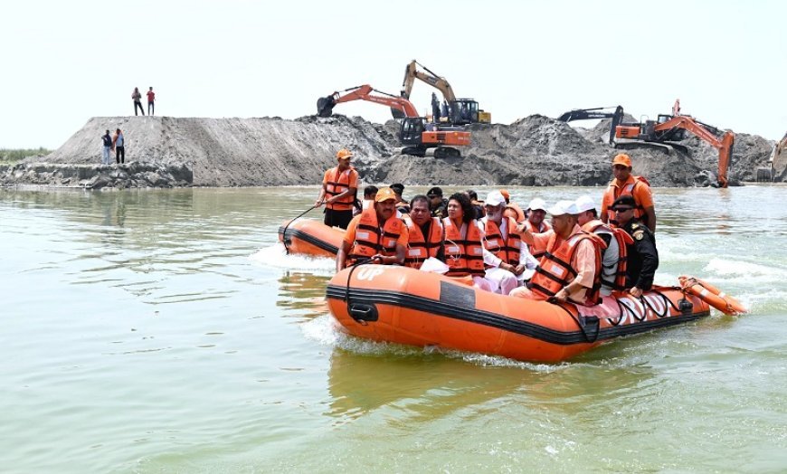 Chief Minister Yogi Adityanath first reviewed details about the Sharda River channelization project. He then boarded a boat to inspect the ongoing work personally. During the inspection, CM Yogi also gave necessary instructions to the officials on-site.