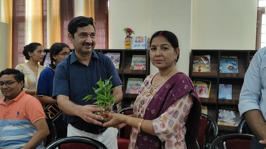 प्रधानाचार्य मोहम्मद राशिद अमिता मिश्रा का हरित पौध देकर स्वागत करते हुए