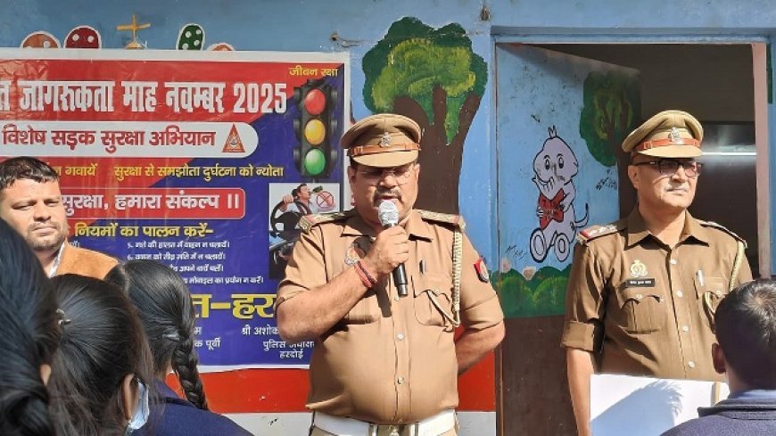 Hardoi: नवंबर यातायात माह पर पुलिस का व्यापक जागरूकता अभियान—‘जान है, जहान है’ थीम के साथ बच्चों को दिए सड़क सुरक्षा के महत्वपूर्ण मंत्र।