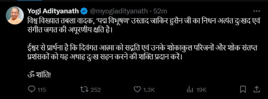 सीएम योगी ने X पर पोस्ट करते हुए लिखा है कि- विश्व विख्यात तबला वादक, ‘पद्म विभूषण’ उस्ताद जाकिर हुसैन जी का निधन अत्यंत दुःखद एवं संगीत जगत की अपूरणीय क्षति है। ईश्वर से प्रार्थना है कि दिवंगत आत्मा को सद्गति एवं उनके शोकाकुल परिजनों और शोक संतप्त प्रशंसकों को यह अथाह दुःख सहन करने की शक्ति प्रदान करें।