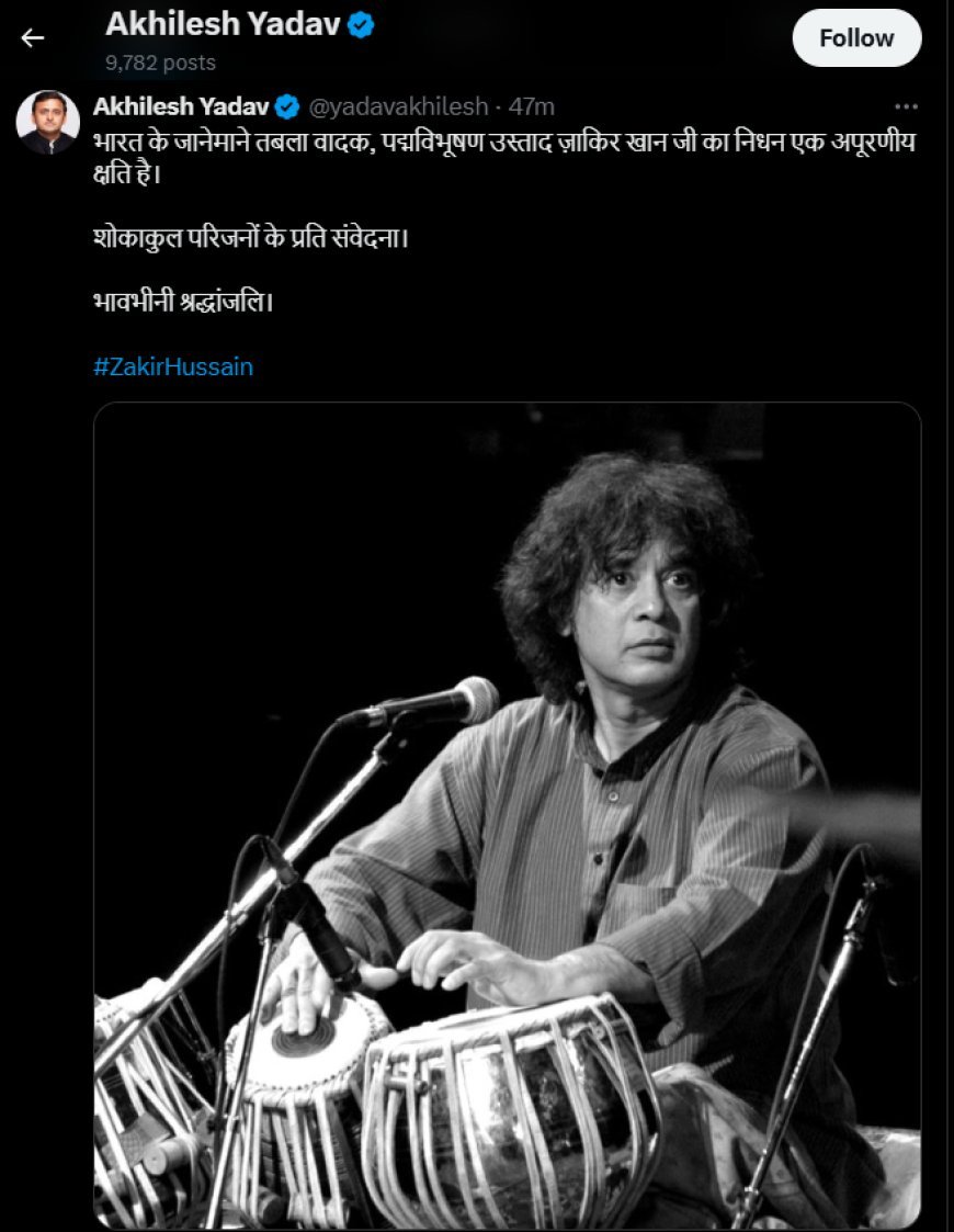 सपा राष्ट्रीय अध्यक्ष अखिलेश यादव ने भी उस्ताद जाकिर हुसैन के निधन पर शोक व्यक्त किया और उन्हें भावभीनी श्रद्धांजलि अर्पित की। साथ ही शोकाकुल परिजनों के प्रति संवेदना व्यक्त की है।