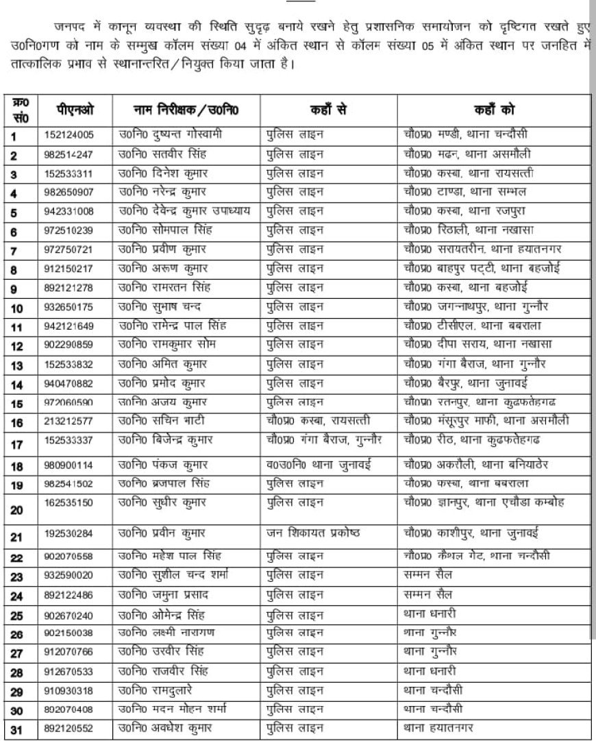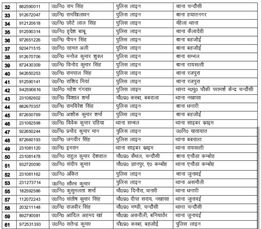 एसपी द्वारा जारी आदेश के अनुसार, तबादलों में पुलिस लाइन, विभिन्न थाना क्षेत्रों और चौकियों पर तैनात उपनिरीक्षकों को नई जिम्मेदारियां सौंपी गई हैं। इस बदलाव में पुलिस लाइन से कई SI को थानों और चौकियों पर भेजा गया है, वहीं कुछ उपनिरीक्षकों को पुलिस लाइन में स्थानांतरित किया गया है। तबादले की सूची में दुष्यन्त गोस्वामी को पुलिस लाइन से थाना चंदौसी के चौकी मण्डी पर, सतवीर सिंह को थाना असमोली के चौकी मढन पर, नरेंद्र कुमार को थाना सम्भल के चौकी टांडा पर, रहमत अली को थाना बहजोई पर भेजा गया है।