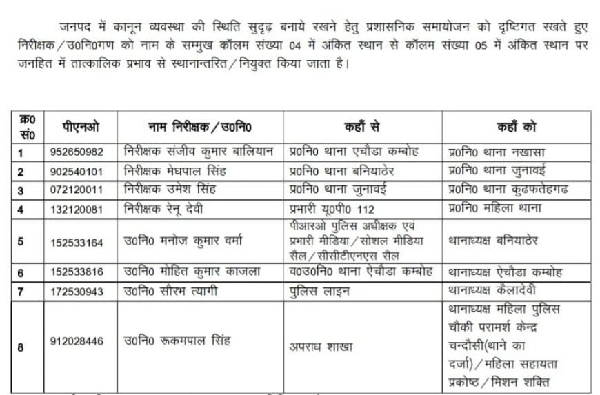 पहले आदेश में 8 अधिकारियों का तबादला किया गया है। इसमें निरीक्षक संजीव कुमार बालियान को थाना ऐचौड़ा कम्बोह से हटाकर थाना नखासा भेजा गया है। निरीक्षक मेघपाल सिंह को थाना बनियाठेर से थाना जुनावई, निरीक्षक उ
