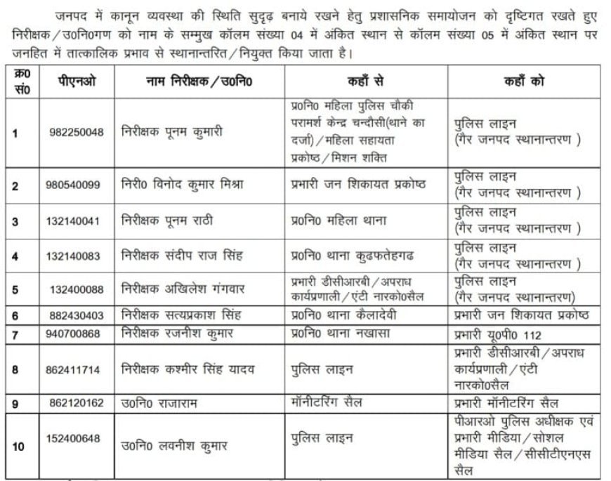 दूसरे आदेश में कुल 10 अधिकारियों का स्थानांतरण हुआ है। निरीक्षक पूनम कुमारी को महिला पुलिस चौकी परामर्श केंद्र चन्दोसी से पुलिस लाइन (गैर जनपद स्थानांतरण) भेजा गया है। निरीक्षक विनोद कुमार मिश्रा को जन शिकायत प्रकोष्ठ प्रभारी पद से पुलिस लाइन (गैर जनपद), निरीक्षक पूनम राठी को महिला थाना से पुलिस लाइन (गैर जनपद), निरीक्षक संदीप राज सिंह को कुढ़फतेहगढ़ से पुलिस लाइन (गैर जनपद), जबकि निरीक्षक अखिलेश गंगवार को डीसीआरबी/एण्टी नारकोटिक्स सेल से पुलिस लाइन (गैर जनपद) स्थानांतरित किया गया है।