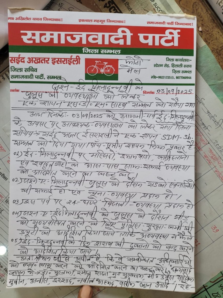 Sambhal : ईद मिलादुन्नबी के जुलूस की व्यवस्थाओं को लेकर सौंपा ज्ञापन, शराब की दुकाने बंद करने की मांग