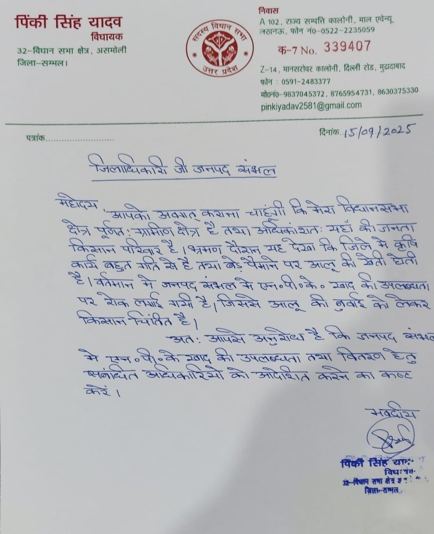 विधायक पिंकी यादव ने पत्र में लिखा कि असमोली विधानसभा क्षेत्र मुख्य रूप से ग्रामीण और पिछड़ा इलाका है, जहां की अधिकांश जनता खेती पर निर्भर है। वर्तमान समय में आलू की फसल बड़ी मात्रा में तैयार हो रही है, लेकिन आलू की खुदाई में सबसे बड़ी समस्या एम.पी.के. खाद (एमोनियम फॉस्फेट) की किल्लत की वजह से आ रही है।