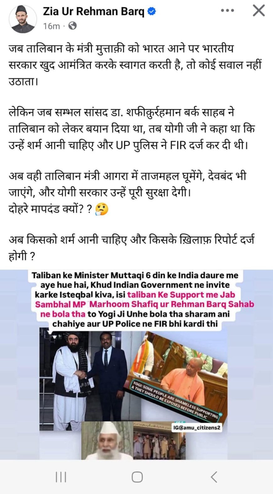 सम्भल। समाजवादी पार्टी के सांसद जियाउर्रहमान बर्क ने अफगानिस्तान के तालिबान सरकार के विदेश मंत्री अमीर खान मुत्ताक़ी के भारत दौरे को लेकर केंद्र और उत्तर प्रदेश सरकार पर निशाना साधा है। सांसद ने अपने फेसबुक पोस्ट में लिखा कि जब तालिबान के मंत्री को भारतीय सरकार खुद आमंत्रित कर स्वागत करती है, तब किसी को आपत्ति नहीं होती।