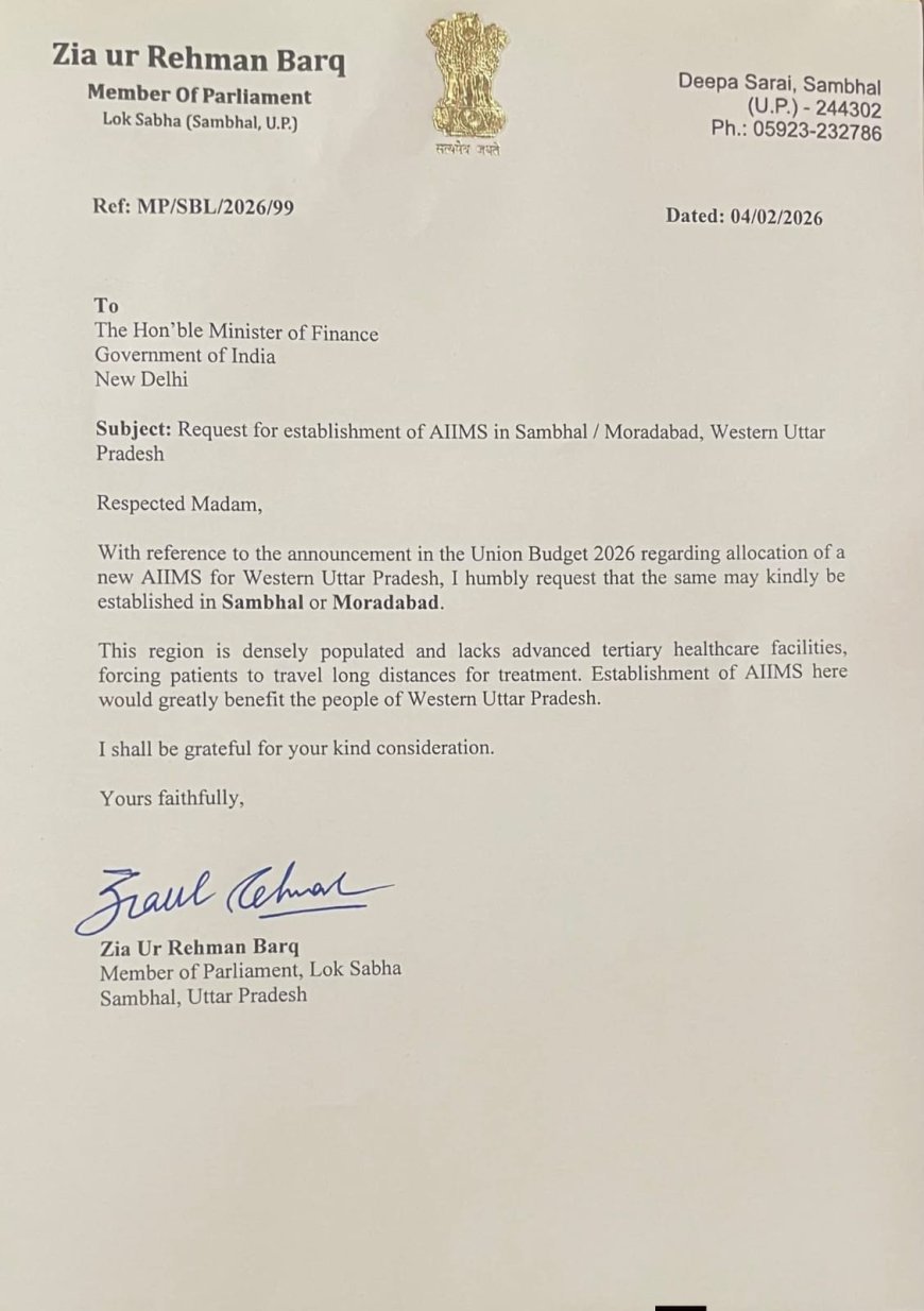 सांसद जियाउर्रहमान बर्क ने वित्त मंत्री को सौंपे गए लिखित अनुरोध पत्र में कहा कि पश्चिमी उत्तर प्रदेश की आबादी घनी है, लेकिन यहां अब तक उन्नत तृतीयक स्वास्थ्य सुविधाओं का गंभीर अभाव है। गंभीर बीमारियों से जूझ रहे मरीजों को दिल्ली, लखनऊ या अन्य बड़े शहरों का रुख करना पड़ता है, जिससे समय और संसाधनों दोनों की भारी क्षति होती है।