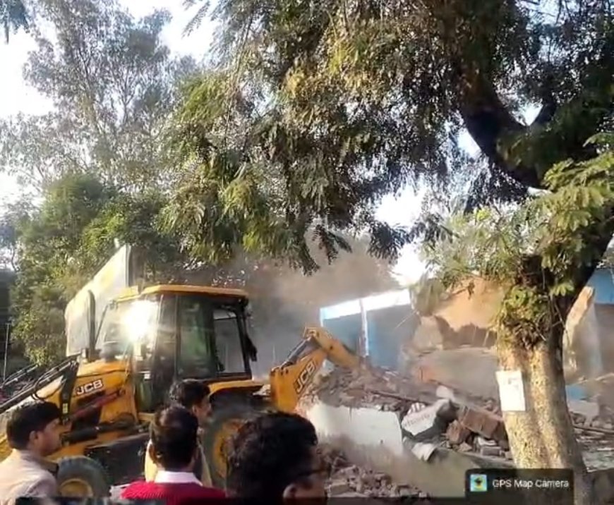 Sitapur : सीतापुर के लहरपुर में तालाब की सरकारी भूमि पर बनी दुकानों पर बुलडोजर कार्रवाई