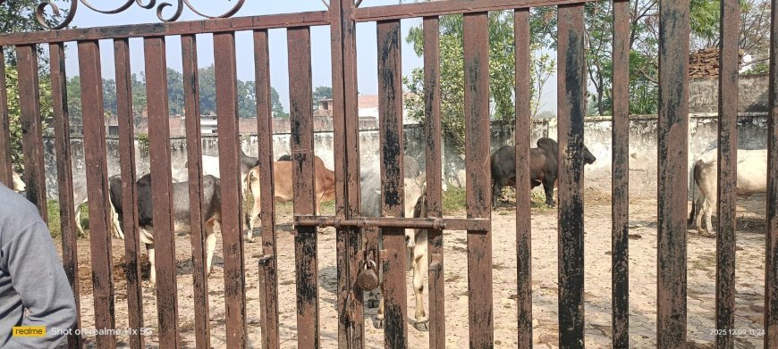 Sitapur : लहरपुर में निराश्रित गोवंशों के आतंक से तंग किसानों ने 16 जानवरों को होलिका स्थल पर बंद किया