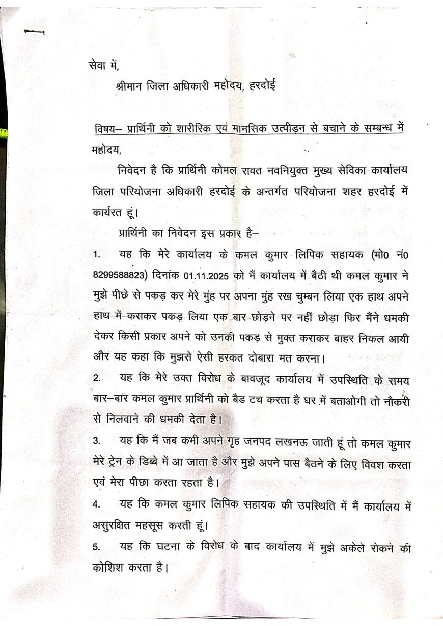 देशभर में महिलाओं की शिक्षा और सशक्तिकरण को बढ़ावा देने के लिए 'बेटी बचाओ, बेटी पढ़ाओ' जैसे नारे दिए जाते हैं, लेकिन जमीनी हकीकत कुछ और ही बयां करती है। छोटे-छोटे गांवों और शहरों से निकलकर मेहनत से पढ़ाई करने वाली लड़कियां जब नौकरी की दहलीज पर कदम रखती हैं, तो अक्सर उन्हें कार्यस्थलों पर गंदी नजर रखने वाले लोगों का शिकार बनना पड़ता है। ऐसी ही एक दिल दहला देने वाली घटना उत्तर प्रदेश के हरदोई जिले से सामने आई है, जहां, हरदोई के जिला कार्यक्रम अधिकारी कार्यालय की शहर परियोजना में नवनियुक्त मुख्य सेविका कोमल रावत ने जिलाधिकारी को लिखित शिकायत दी है कि कार्यालय के ही लिपिक सहायक कमल कुमार ने उनके साथ बार-बार छेड़खानी की, जबरन गलत ढंग से छुआ, गलत हरकतें करने की कोशिश और हाथ पकड़कर खींचा।